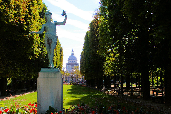 パリ、リュクサンブール公園にある彫刻「L'acteur grec」。作者はシャルル=アルテュール・ブルジョワ(Charles-Arthur Bourgeois、1838年~1886年)。なお、後方に見える建物はパンテオンのドームである。 リュクサンブール公園には様々なテーマの彫刻が106体ある。以前紹介したドラクロワ像のような芸術家の彫像が39体と最も多いが、このアルテュール・ブルジョワの彫刻のように、古代や神話を題材にとった作品も数多い。 |